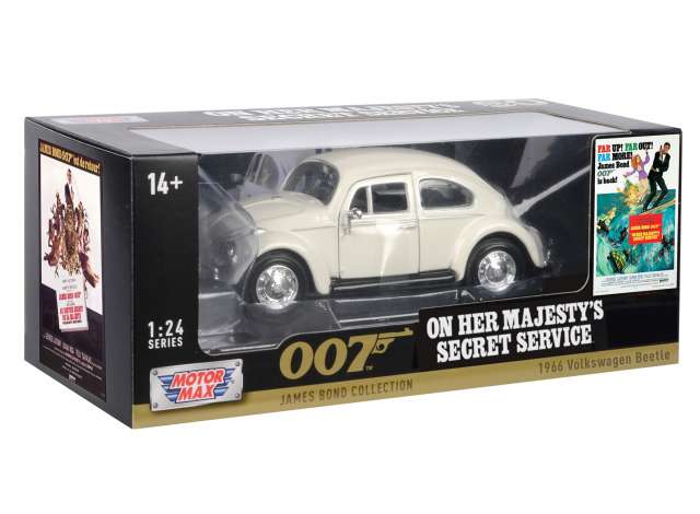 Model Car presenta il modellino della Wolkswagen Beetle da JAMES BOND 007: Al servizio segreto di sua Maestà del 1966. In scala 1/24, completamente in metallo, con sportelli apribili e parti mobili.
