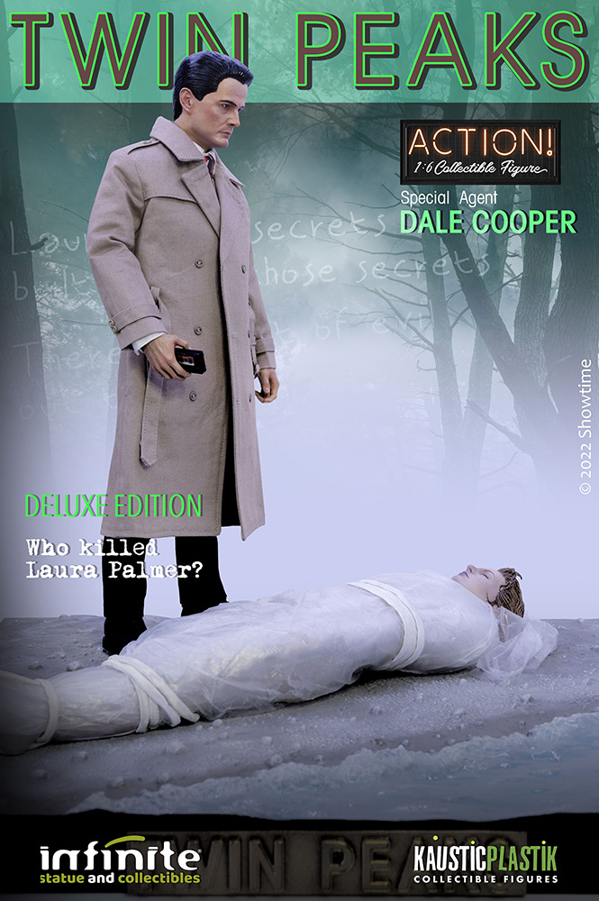 L’action figure è realizzata e dipinta a mano con cura meticolosa e grandi dettagli. La figura alta 30 cm e dipinta a mano è in scala 1/6 con vestiti in stoffa e include una serie di accessori e parti intercambiabili come: 8 mani intercambiabili, impermeabile e distintivo dell’FBI, pantaloni neri, camicia bianca, cravatta, giacca nera con spilletta FBI, torcia, pistola (Smith & Wesson Model 66), mini registratore audio, lente d’ ingrandimento, tazza da caffè, scarpe nere (Magnetiche), stand standard magnetico, cartellina FBI con report dell’autopsia e prove investigative (in scala 1:6), Laura Palmer scena del crimine: È morta…è avvolta nel cellophane, Twin Peaks Deluxe Diorama Stand.