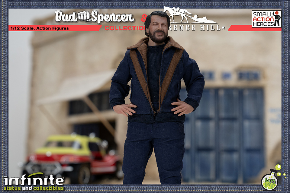 La figure alta circa 16 cm è scolpita con estrema somiglianza a Bud Spencer come appare nel film “Altrimenti ci Arrabbiamo” e include svariati accessori come: 10 mani intercambiabili, un corpo articolato, una giacca blu con decorazioni marroni, una camicia grigia, un paio di pantaloni e una coppia di stivali marroni in PVC.