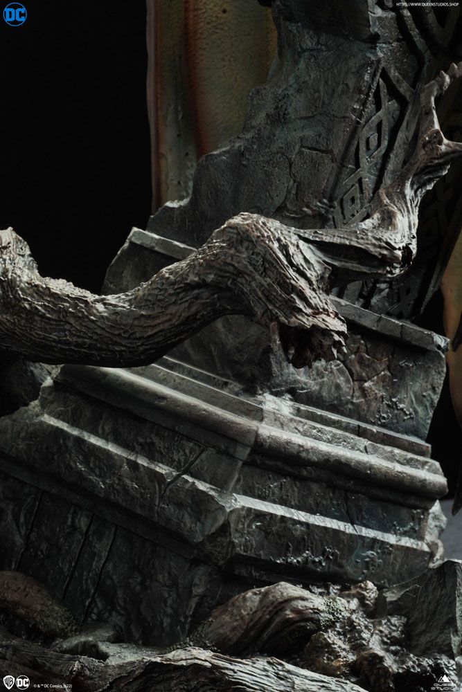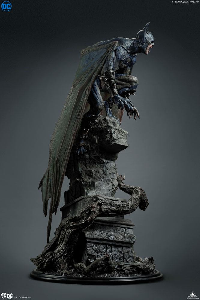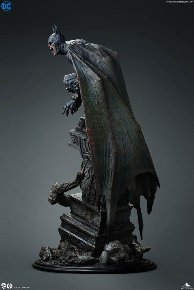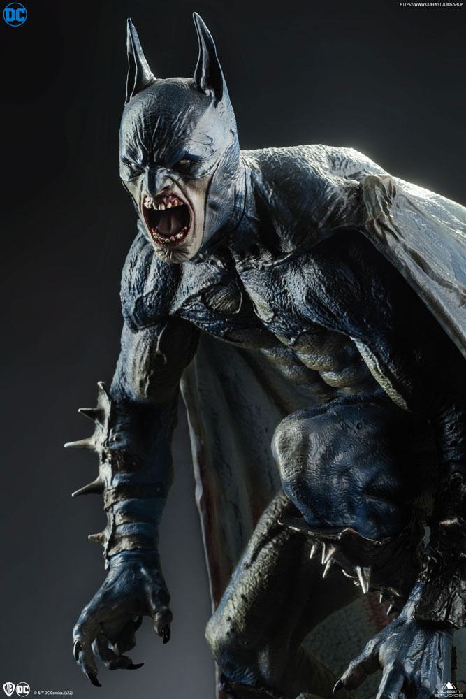 Il risultato è questa terrificante raffigurazione di Batman demoniaco in scala 1/4, alto 72 cm, appollaiato su una lapide come un gargoyle, con occhi rossi di rabbia, pelle increspata e ali che penzolano dietro di lui allungandosi a terra.