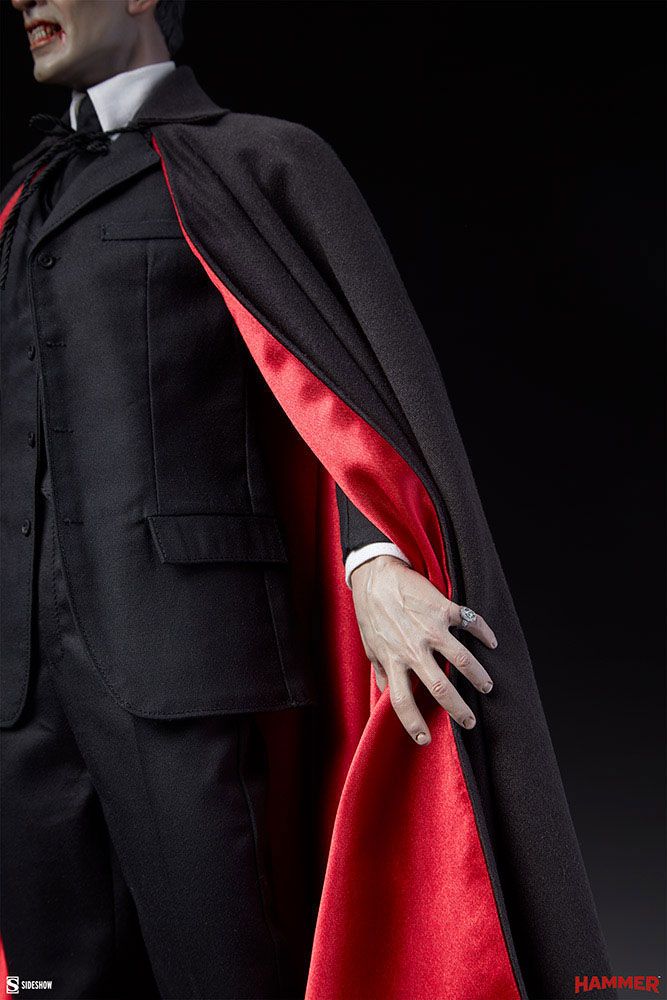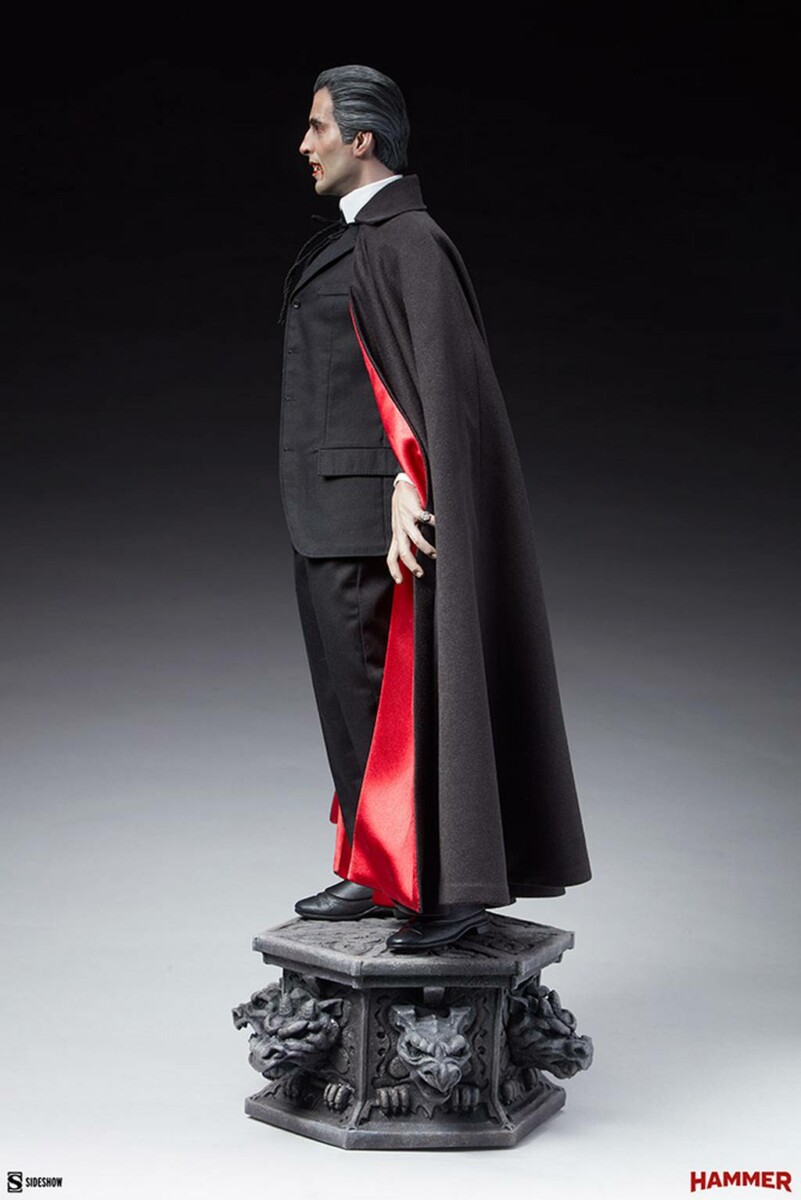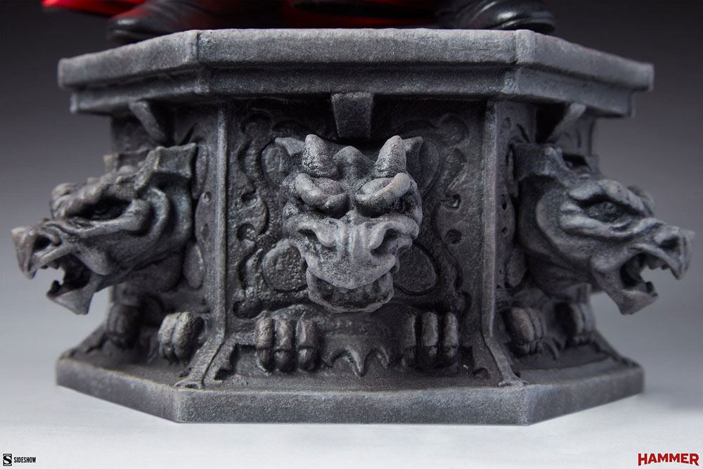 La statua misura 56 cm e raffigura Dracula su una base simile ad una pietra con gargoyles gotici ed è scolpita con incredibile somiglianza all’attore Christopher Lee.