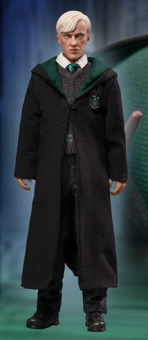La figure in scala 1/6, alta 26 cm con 30 punti di articolazione e un tattuaggio sulla mano sinistra è scolpita sulle sembianze dell’attore Tom Felton e ritrae Draco come lo abbiamo visto in harry Potter e il Principe Mezzo Sangue.