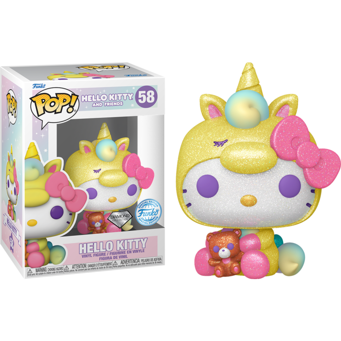 Funko presenta questa action figure in vinile di Hello Kitty Unicorn, versione Diamond Glitter, in edizione limitata, continuando la sua produzione di successo di repliche dei personaggi giapponesi.