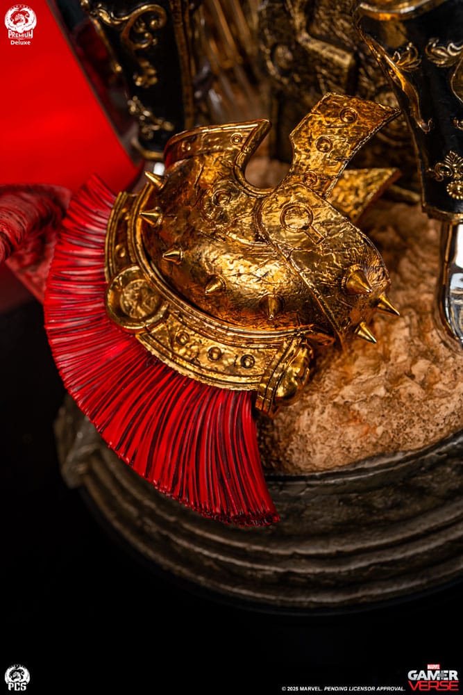 La massiccia spallina in bronzo sulla spalla sinistra, segnata da danni di battaglia, è collegata a una serie di cinghie che fungono anche da fodero per la gigantesca spada sulla sua schiena. I suoi bracciali e schinieri decorati in modo elaborato, insieme a un perizoma rosso-marrone, donano a questo viaggiatore galattico un aspetto chiaramente romano, perfetto per la gigantesca arena in cui è tenuto prigioniero.