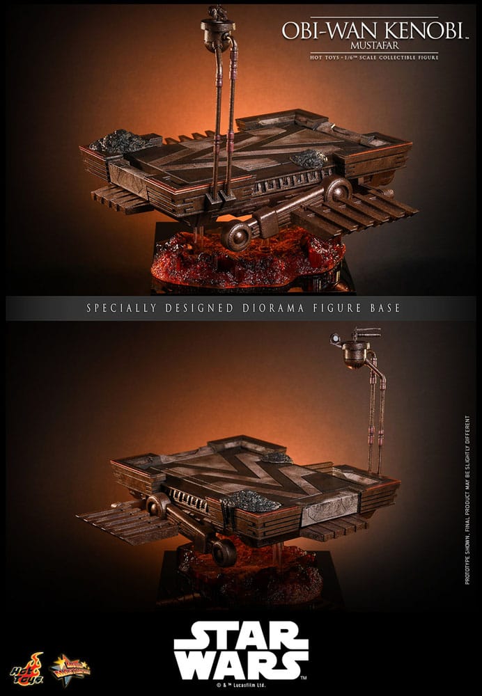 La figure è esposta su una base diorama appositamente progettata, con piattaforma repulsore e effetti lava che riproducono il paesaggio vulcanico di Mustafar, consentendo di ricreare l’iconico duello tra Obi-Wan Kenobi e Anakin Skywalker.