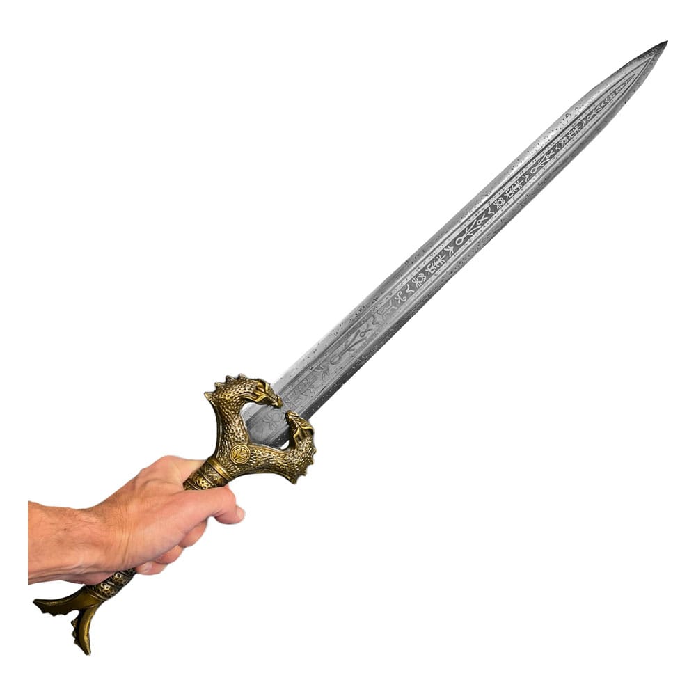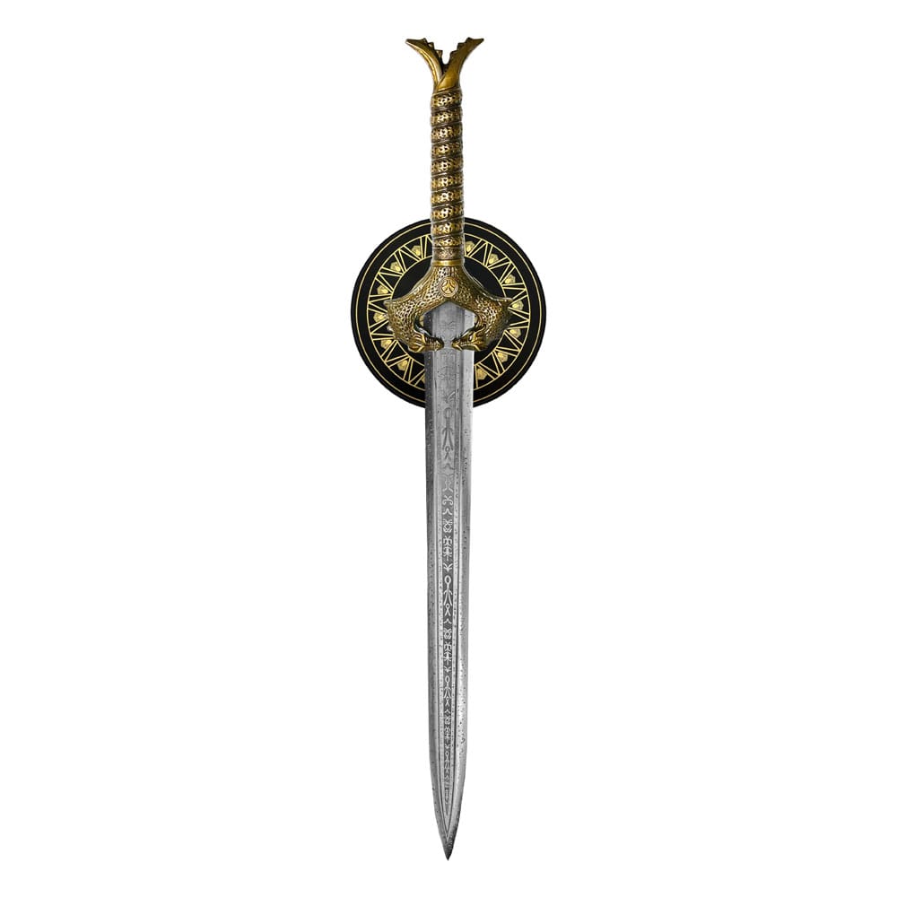 In scala 1/1 la spada è lunga circa 79 cm ed è stata copiata direttamente dall’originale con particolare attenzione ai dettagli. Ha la lama forgiata a mano lucidata a specchio in acciaio inossidabile H1 con caratteri runici amazzonici incisi. L’elsa in lega di ottone pressofusa senza cuciture.
