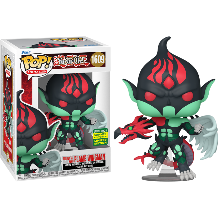 Funko presenta questa action figure in vinile di Elemental Hero Flame Wingman da Yo-Gi-Oh!, in edizione limitata, con bollino Summer Convention 2024, continuando la sua produzione di successo di repliche dei personaggi dei manga giapponesi.